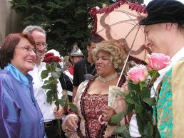 Rosenkavalier*innen in historischen Kostümen verzaubern mit ihrem romantischen Rosengedicht.